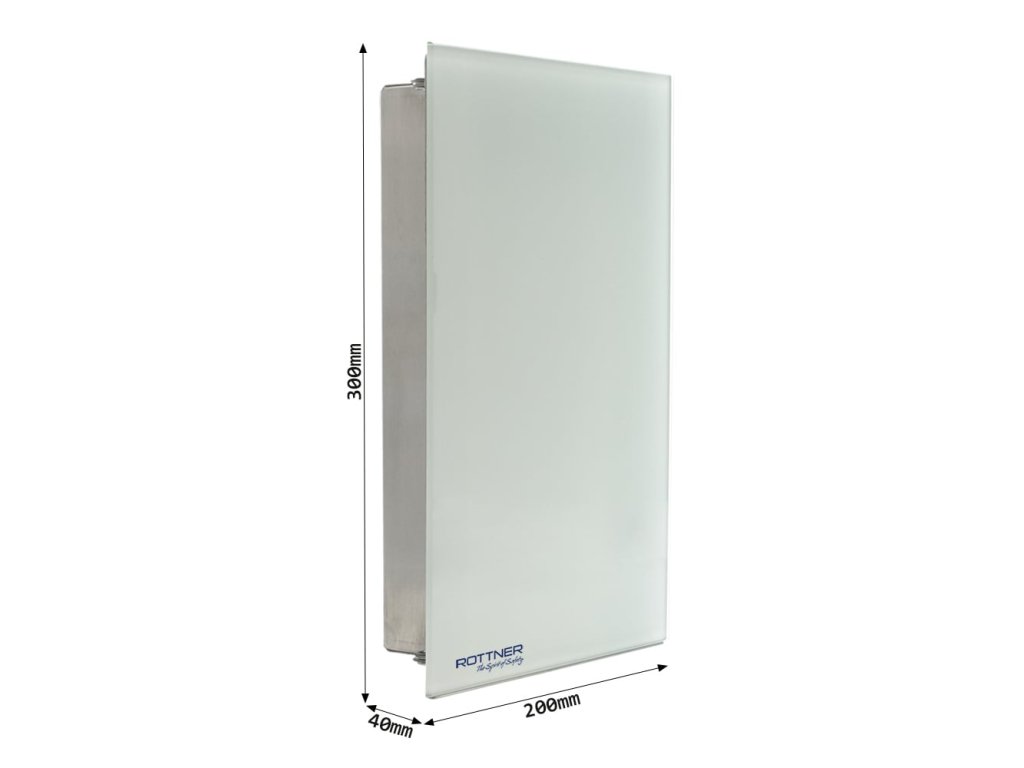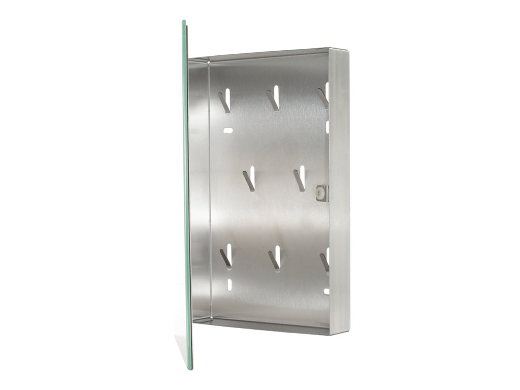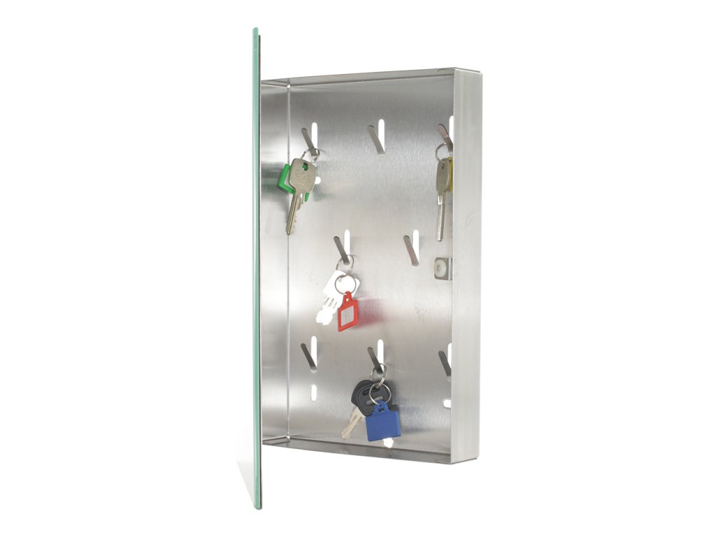 Skrinka na kľúče KEY GLASS upúta moderným dizajnom so sklenenými prednými dverami a zatváraním na magnet. Vo vnútri skrinky je priestor pre 8 kľúčov. Súčasťou balenia je aj držiak s magnetom a perom. Na sklenené magnetické dvere môžete napísať odkaz perom alebo môžete pripevniť odkaz magnetom. Balenie obsahuje potrebný kotviaci materiál pre pripevnenie na stenu. Na zadnej strane sa nachádzajú otvory na ukotvenie.