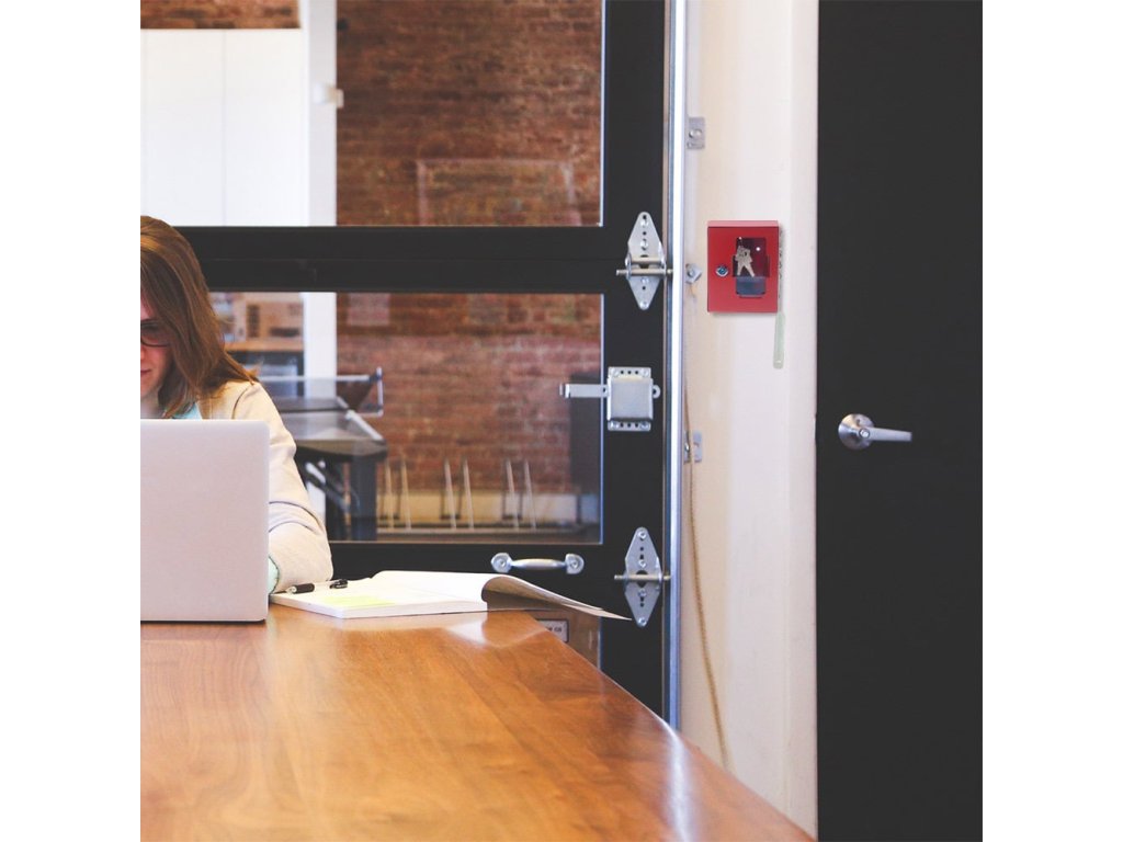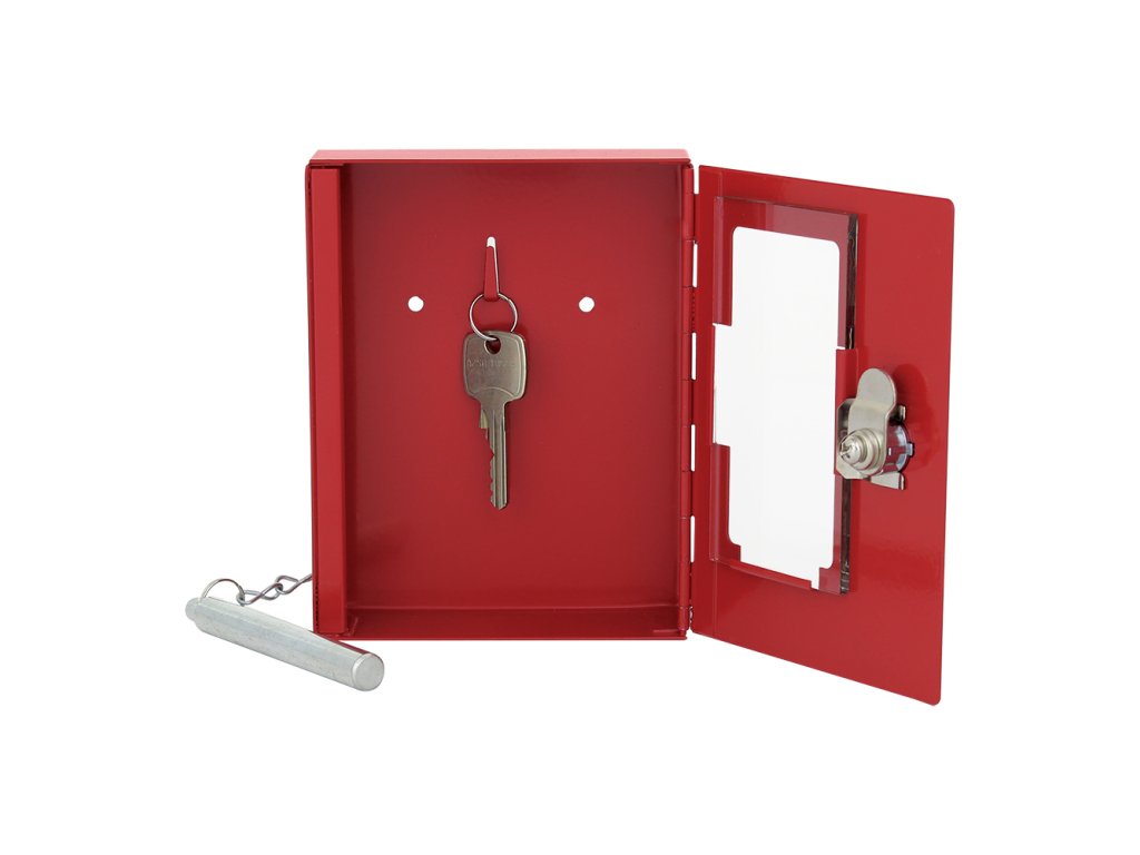 Červená skrinka na kľúč, ktorá sa používa na uschovanie dôležitého kľúča alebo zväzku viacerých kľúčov. V prípade potreby je možné sklo rozbiť pomocou pripevneného kladivka. Balenie obsahuje materiál na ukotvenie skrinky na stenu.