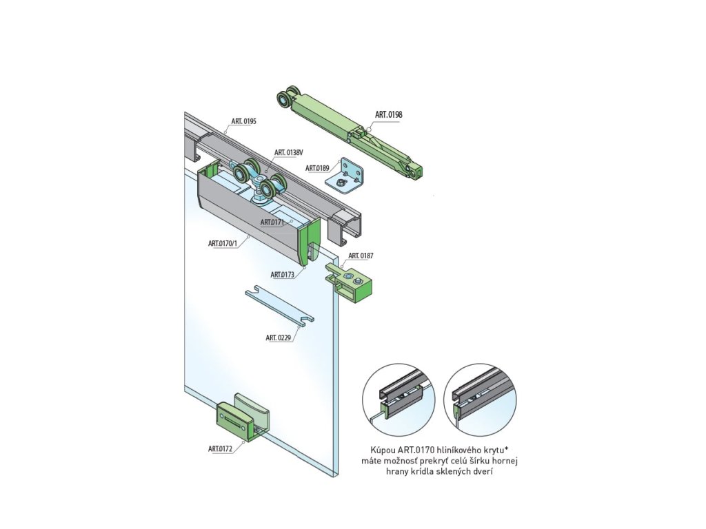 Balenie posuvného systému SILENT GLASS obsahuje krytky na prekrytie držiakov skla, ale je možné dokúpiť si samostatne hliníkový kryt ART.0170 na prekrytie celej šírky sklených dverí. Hliníkový kryt GLASS hornej hrany skla je potrebné kúpiť v šírke skla pre vnútornú aj vonkajšiu stranu (2 krát šírka krídla sklených dverí).