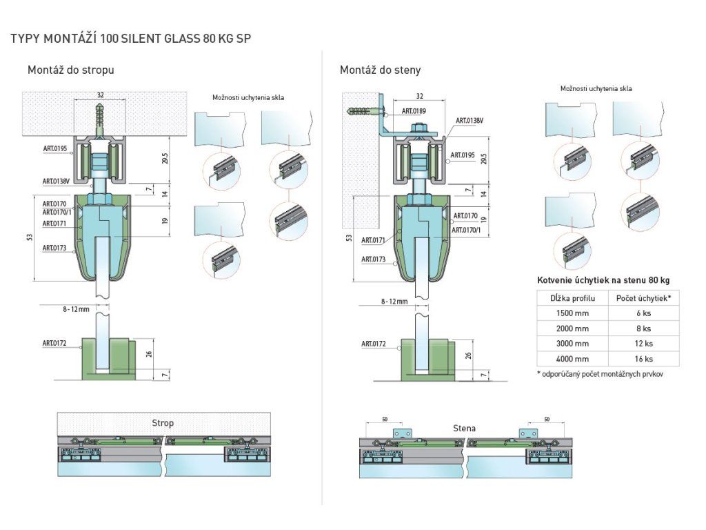 SC – posuvný systém SERIES 100 SILENT GLASS S pre jednokrídlové dvere 1D 2000/80 SP obsahuje: