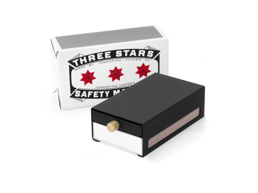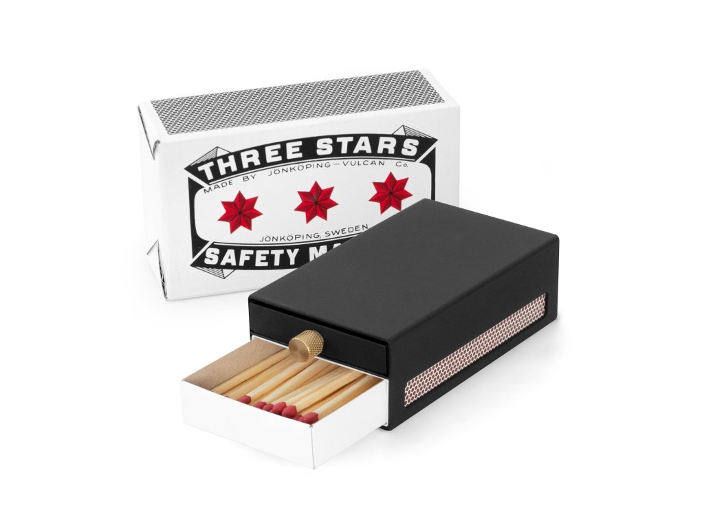 Neskrývajte svoje zápalky, vystavte ich v tomto elegantnom dizajnovom obale. Kovový obal obsahuje dve zásuvky. Vrchná kovová zásuvka je ozdobená zlatou úchytkou, ktorá je určená na použité zápalky. Keď sa zaplní, jednoducho zásuvku vytiahnete a obsah vysypete do odpadu. V druhej zásuvke je umiestnená zápalková krabička obsahujúca 50 ks dlhých švédskych zápaliek.
