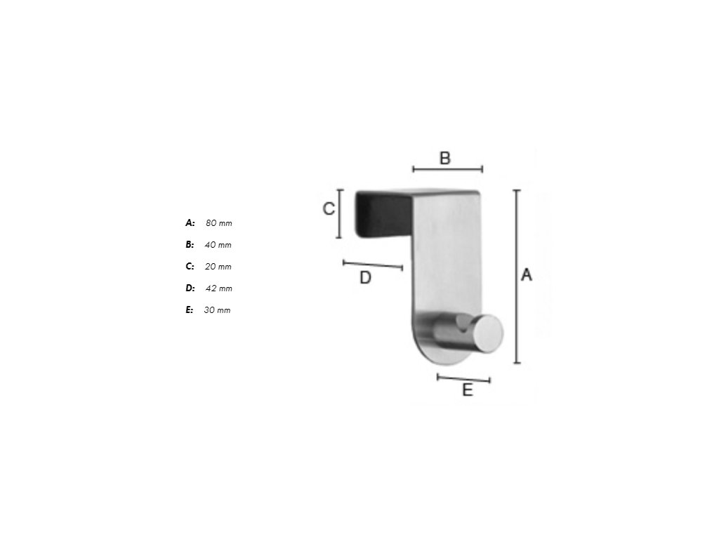 Háčik na dvere je vyrobený z vysokokvalitnej nehrdzavejúcej ocele, známej ako nerez a je povrchovo upravený, s rozmermi: d/v/h 40 mm/80 mm/30 mm, vnútorný rozmer 42 mm, séria BeslagsbodenDodatočné parametre