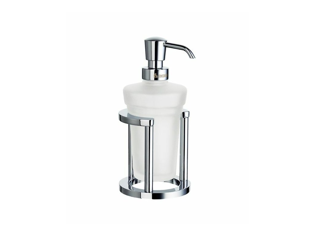 Dávkovač tekutého mydla s držiakom, voľne stojaci, dávkovač z kvalitnej masivnej mosadze s objemom 250 ml a výškou 180 mm, matné sklo, séria Outline.