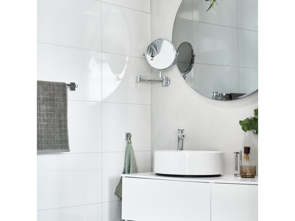 Závesné kozmetické zrkadlo je vyrobené z materiálov vysokej kvality - mosadz a je povrchovo upravené, s priemerom 200 mm a dĺžkou ramena 340 mm, obojstranné - normálne a zväčšovacie 5x, séria Outline.