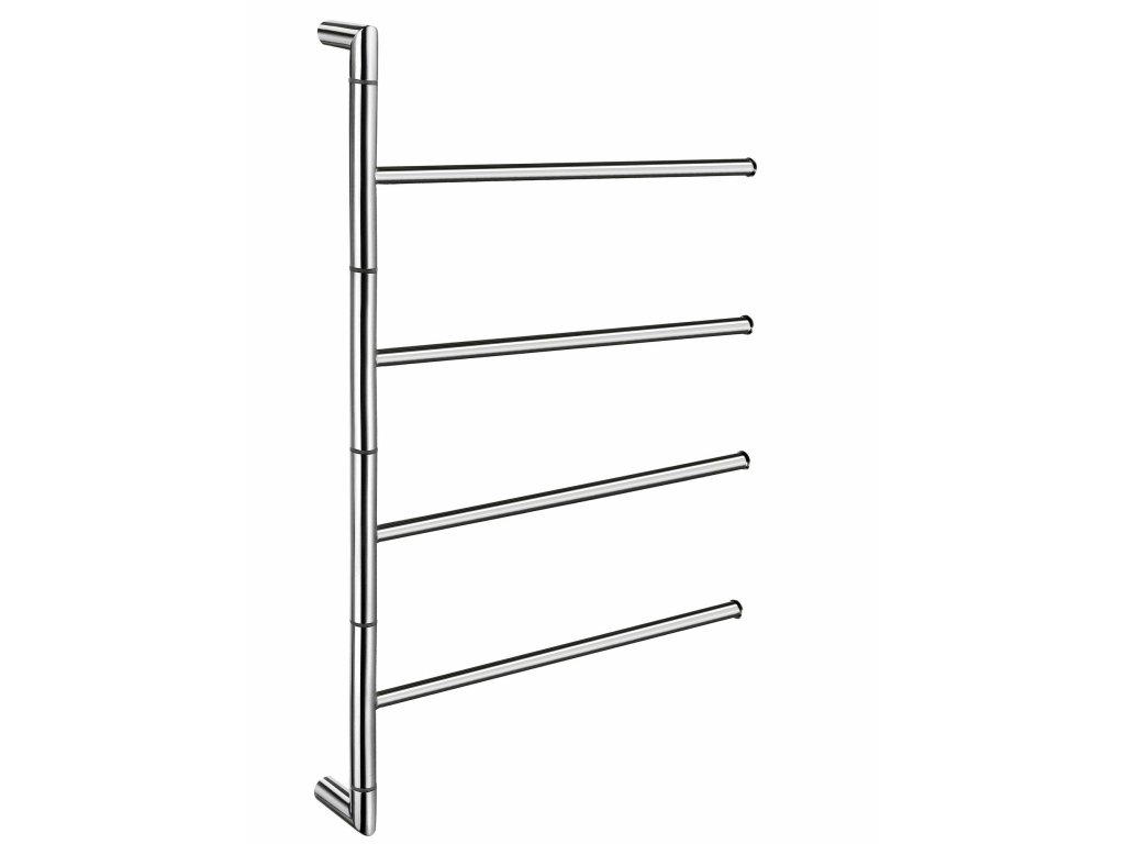 Závesný otočný držiak na uterák je vyrobený z vysokokvalitnej nehrdzavejúcej ocele, známej ako nerez a je povrchovo upravený, so 4 pohyblivými ramenami s celkovou výškou 630 mm, dĺžkou 387 mm a hĺbkou ramena 60 mm, maximálna dĺžka vrátane ramien 447 mm, vertiálna inštalácia (skryté upevnenie), nevhodné pre použitie do sprchy, séria Outline lite.