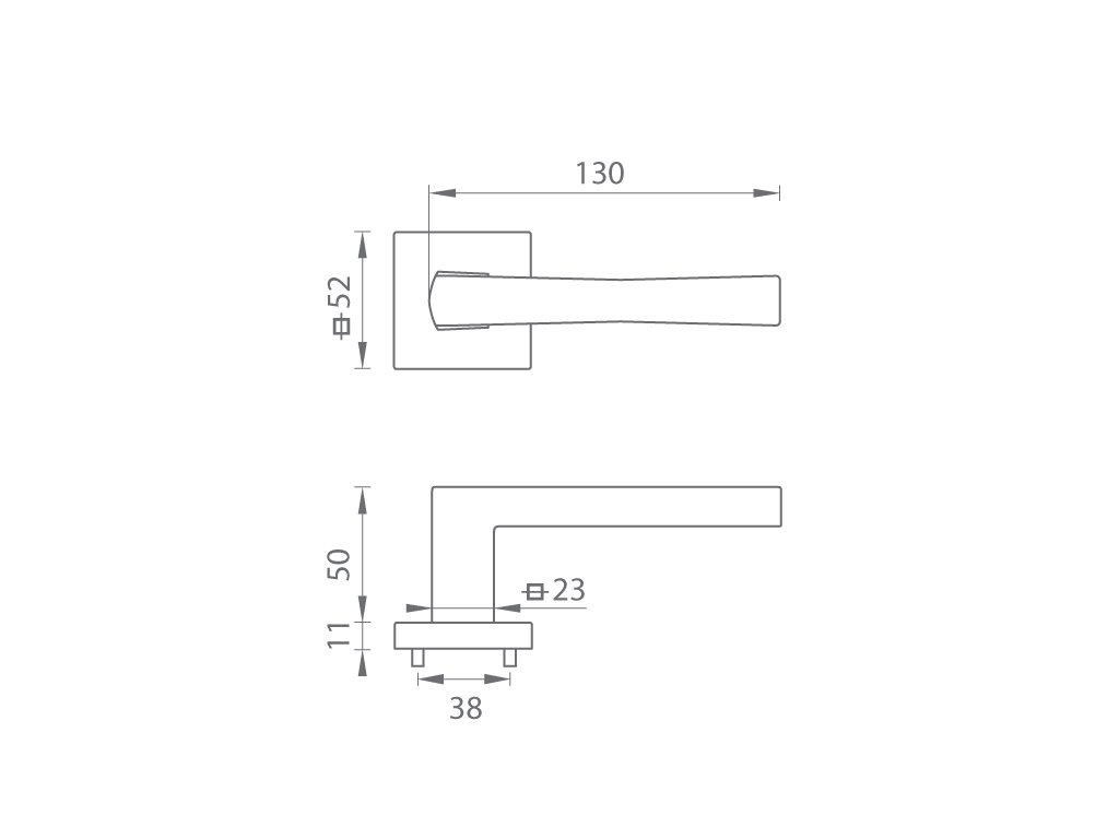 Rozetová kľučka na interiérové dvere s hranatou rozetou je vyrobená z vysokokvalitnej nehrdzavejúcej ocele, známej ako nerez a je povrchovo upravená. Rozeta má rozmery 52 mm x 52 mm a štandardnú hrúbku 11 mm.