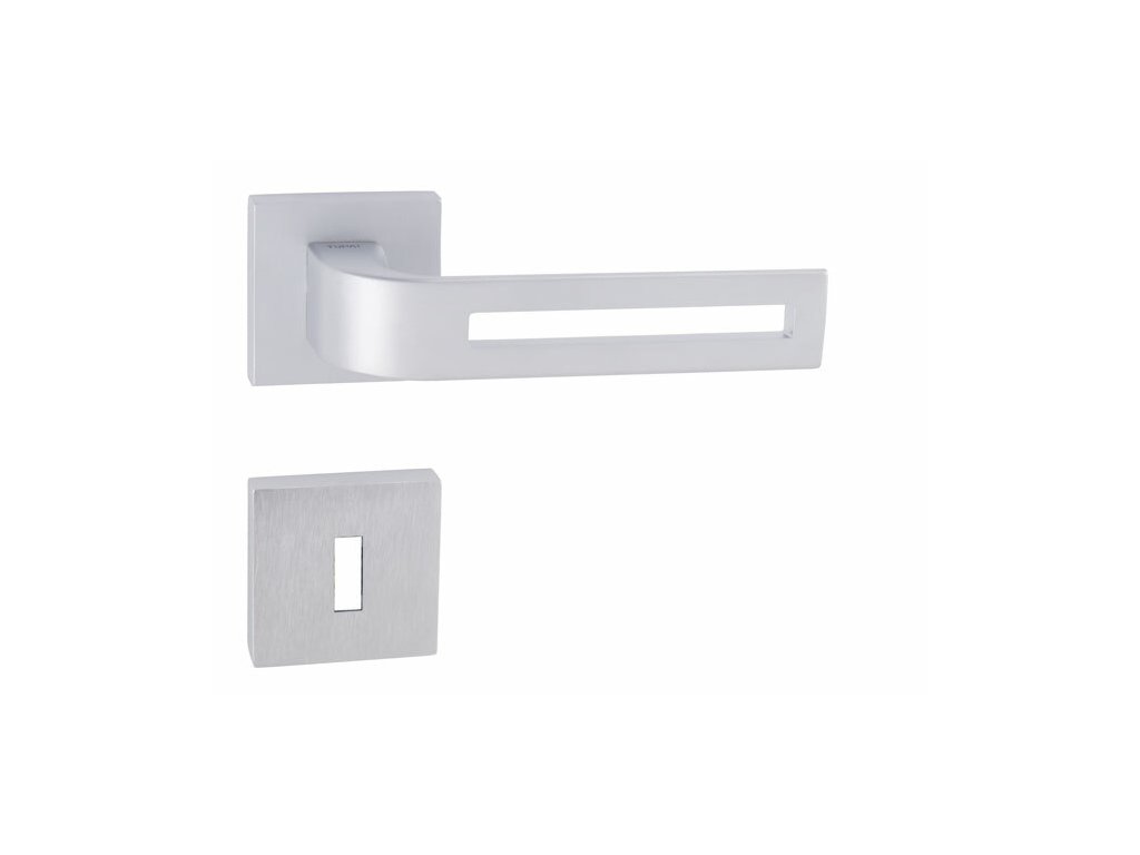 Rozetová kľučka na interiérové dvere s hranatou rozetou je vyrobená z materiálov vysokej kvality - zamak a je povrchovo upravená. Rozeta má rozmery 52 mm x 52 mm a štandardnú hrúbku 11 mm.