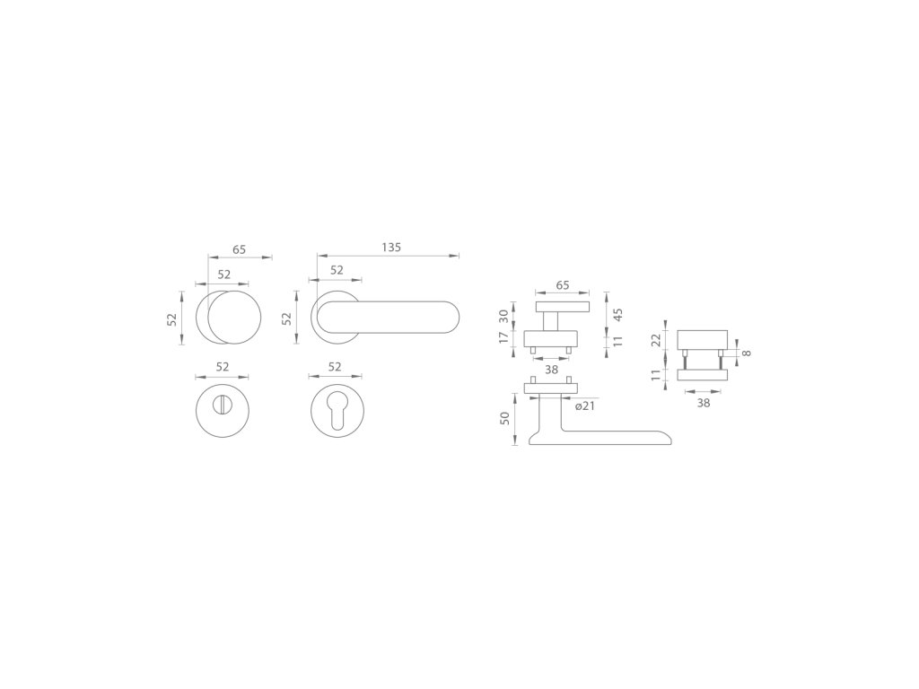 Bezpečnostná interiérová rozetová kľučka na vchodové a bezpečnostné dvere s okrúhlou rozetou s prekrytím cylindrickej vložky je vyrobená z materiálov vysokej kvality – zamak / oceľ a je povrchovo upravená. Okrúhla rozeta má priemer 52 mm a hrúbku 17 mm.