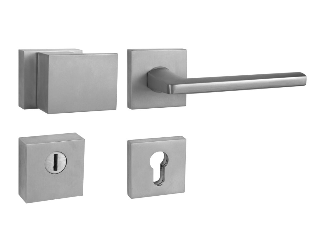 Bezpečnostná interiérová rozetová kľučka na vchodové a bezpečnostné dvere s hranatou rozetou s prekrytím cylindrickej vložky je vyrobená z materiálov vysokej kvality – zamak / oceľ a je povrchovo upravená. Hranatá rozeta má rozmery 52 mm x 52 mm (resp. 55 mm x 52 mm) a hrúbku 17 mm.