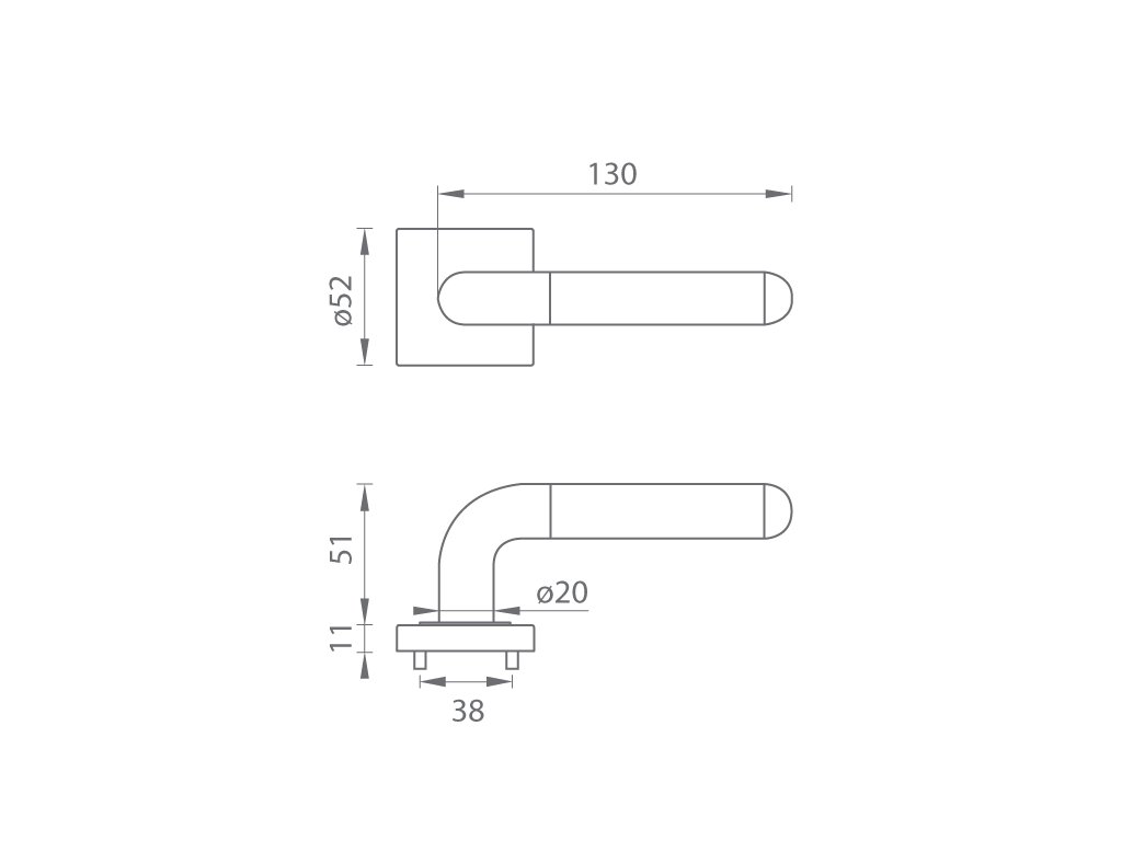 Rozetová kľučka na interiérové dvere s hranatou rozetou je vyrobená z materiálov vysokej kvality - zamak a z vysokokvalitnej nehrdzavejúcej ocele, známej ako nerez a je povrchovo upravená. Rozeta má rozmery 52 mm x 52 mm a štandardnú hrúbku 11 mm.