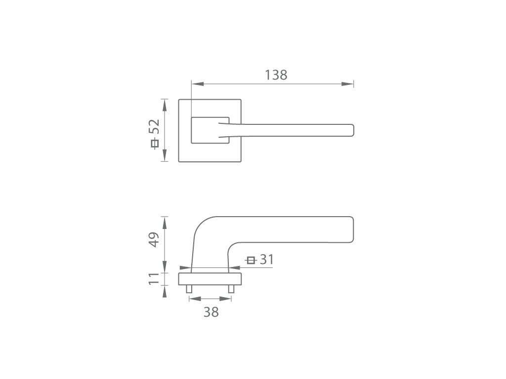 Rozetová kľučka na interiérové dvere s hranatou rozetou je vyrobená z materiálov vysokej kvality - mosadz a je povrchovo upravená. Rozeta má rozmery 52 mm x 52 mm a štandardnú hrúbku 11 mm.
