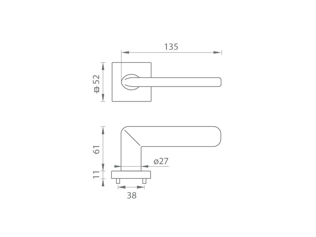 Dizajnová rozetová kľučka na interiérové dvere vyrobená z kvalitného materiálu - mosadz. Štvorcová rozeta má rozmer 52 x 52 mm a hrúbku len 5 mm.