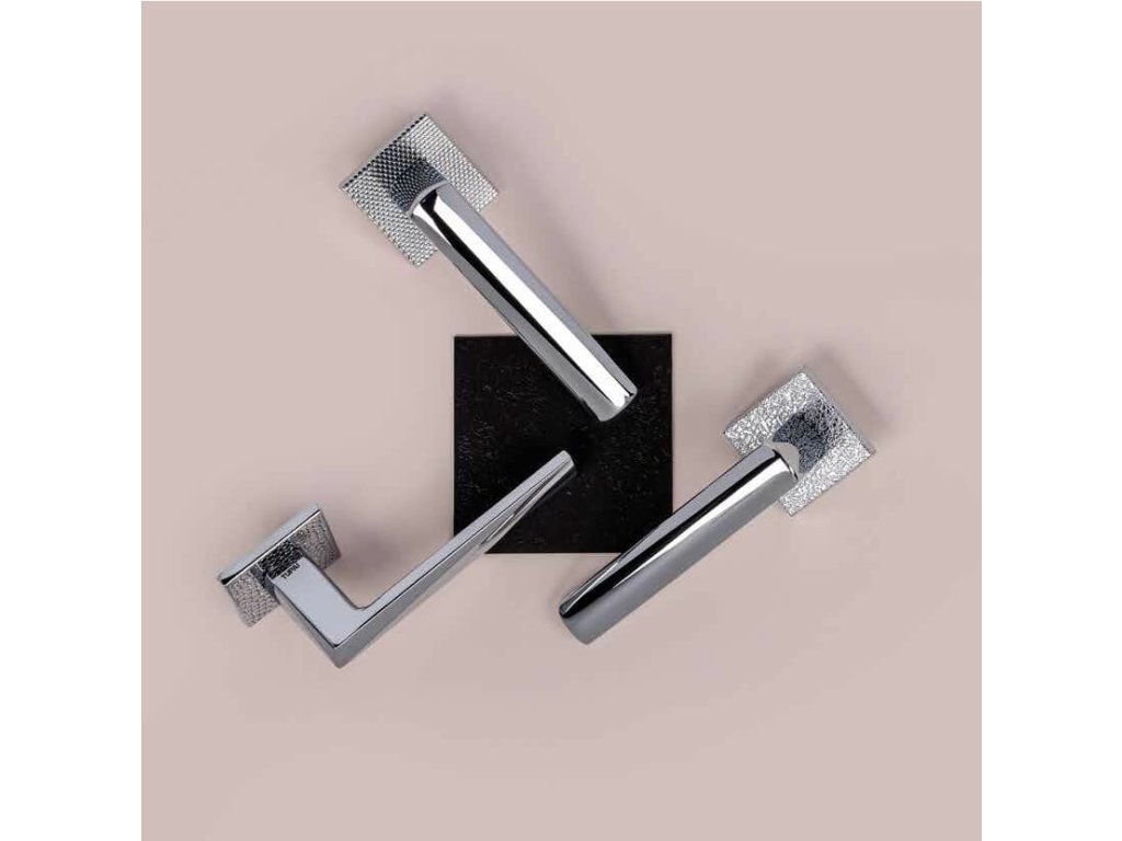 Dizajnová rozetová kľučka na interiérové dvere vyrobená z kvalitného materiálu - mosadz. Štvorcová rozeta má rozmer 52 x 52 mm a hrúbku len 5 mm.