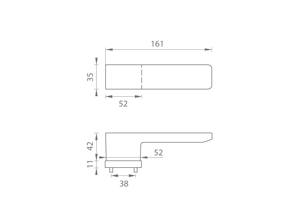 Rozetová kľučka na interiérové dvere s obdĺžnikovou rozetou je vyrobená z materiálov vysokej kvality - zamak a je povrchovo upravená. Rozeta má rozmery 52 mm x 35 mm a štandardnú hrúbku 11 mm. Samotná rozeta je súčasťou dizajnu kľučky.