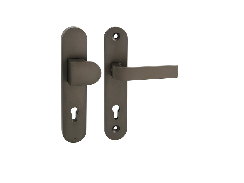 Štítová kľučka na vchodové a bezpečnostné dvere s bezpečnostným oválnym štítom bez prekrytia cylindrickej vložky je vyrobená z materiálov vysokej kvality – zamak a je povrchovo upravená. Oválny štít má rozmery 52 mm x 250 mm a hrúbku 17 mm.