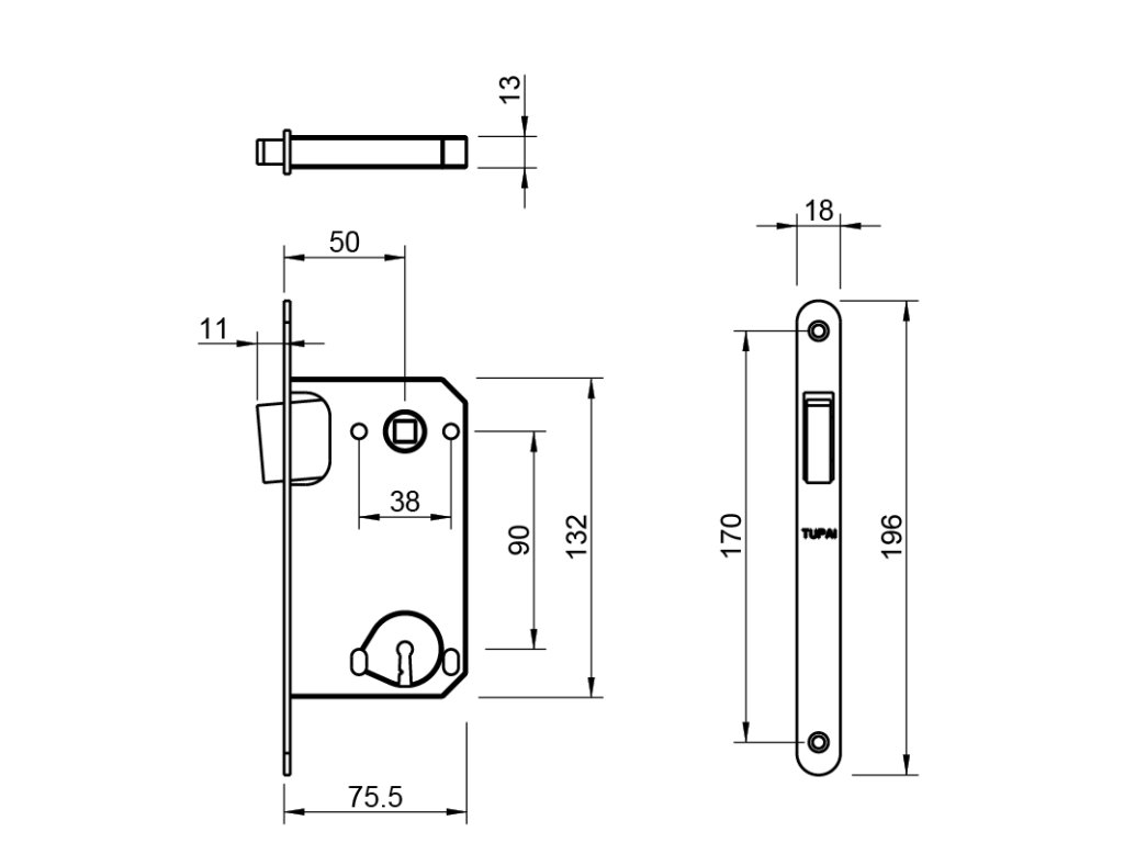 Magnetický zámok do dverí s otvorom pre interiérový kľúč (BB) s rozmermi čela zámku v dĺžke 196 mm, šírke 18 mm. Rozteč (vzdialenosť medzi otvorom na kľučku a vložkou/kľúčom) - 90 mm, zádlab - 73 mm a dormas (vzdialenosť osi kľučky od lišty zámku) - 50 mm.