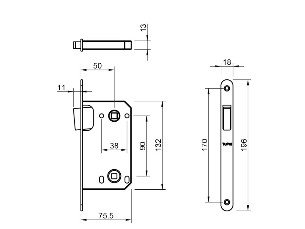 Magnetický zámok do dverí s otvorom pre WC kľúč s rozmermi čela zámku v dĺžke 196 mm, šírke 18 mm. Rozteč (vzdialenosť medzi otvorom na kľučku a vložkou/kľúčom) - 90 mm, zádlab - 73 mm a dormas (vzdialenosť osi kľučky od lišty zámku) - 50 mm.