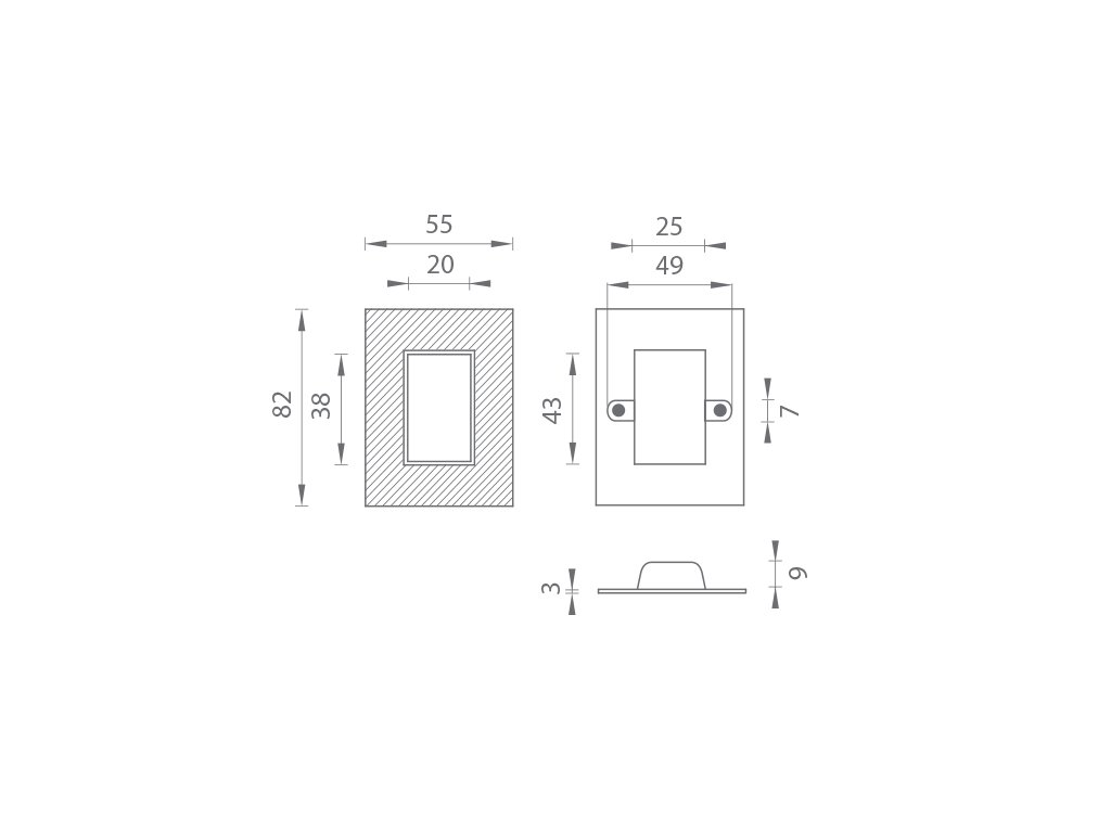 Hranatá mušľa na posuvné dvere je vyrobená z materiálov vysokej kvality – zamak a je povrchovo upravená. Mušľa má výšku 82 mm, šírku 55 mm, zádlab 6 mm a celkovú hrúbku 9 mm. Upevnenie samoreznou skrutkou - Súčasťou balenia sú samorezné skrutky v príslušnom počte. Montáž krytky, mušle na magnet. Cena je uvedená za kus.
