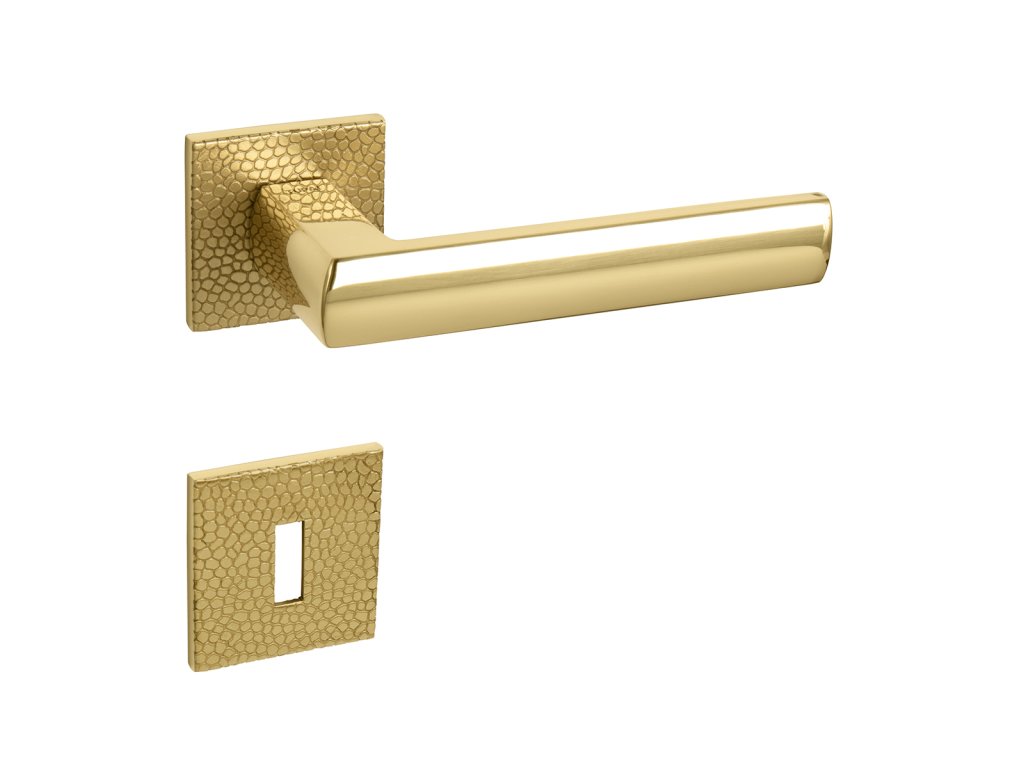 Dizajnová rozetová kľučka na interiérové dvere vyrobená z kvalitného materiálu - mosadz. Štvorcová rozeta má rozmer 52 x 52 mm a hrúbku len 5 mm.