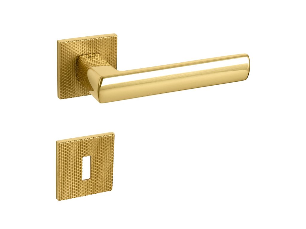 Dizajnová rozetová kľučka na interiérové dvere vyrobená z osvedčeného materiálu vysokej kvality - mosadz. Štvorcová rozeta má rozmer 52 x 52 mm a hrúbku len 5 mm.