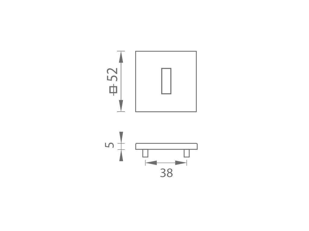 Hranatá rozeta je vyrobená z materiálov vysokej kvality - mosadz a je povrchovo upravená. Rozeta má rozmery 52 mm x 52 mm, hrúbku len 5 mm a hranatý otvor pre interiérový klúč (BBQ), otvor pre cylindrickú vložku (PZ) alebo WC set s vmontovaným kľúčom.