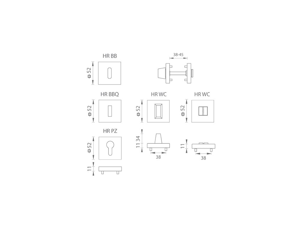 Hranatá rozeta je vyrobená z materiálov vysokej kvality - mosadz a je povrchovo upravená. Rozeta má rozmery 52 mm x 52 mm, hrúbku 11 mm a oválny otvor pre interiérový kľúč (BB), hranatý otvor pre interiérový klúč (BBQ), otvor pre cylindrickú vložku (PZ), WC set s vmontovaným kľúčom alebo rozetu bez otvoru tzv. záslepka. Balenie obsahuje 2 kusy roziet (pár) a rozety WC sú v balení ako set.
