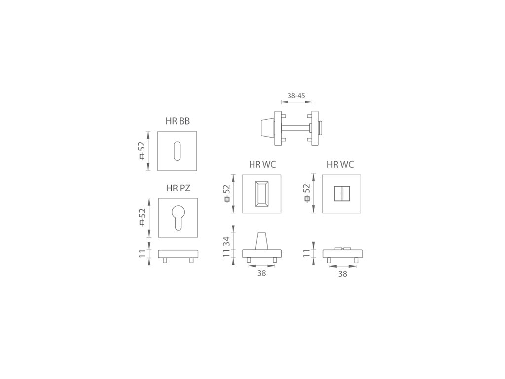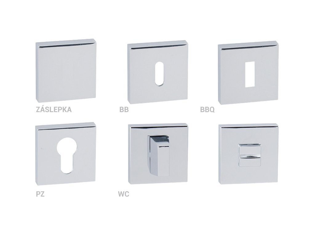 Hranatá rozeta je vyrobená z vysokokvalitnej nehrdzavejúcej ocele, známej ako nerez a je povrchovo upravená. Rozeta má rozmery 52 mm x 52 mm, hrúbku 11 mm a oválny otvor pre interiérový kľúč (BB), otvor pre cylindrickú vložku (PZ), WC set s vmontovaným kľúčom alebo rozeta bez otvoru tzv. záslepka. Balenie obsahuje 2 kusy roziet (pár) a rozety WC sú v balení ako set.