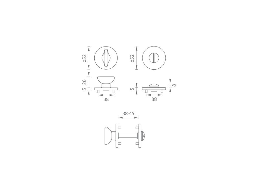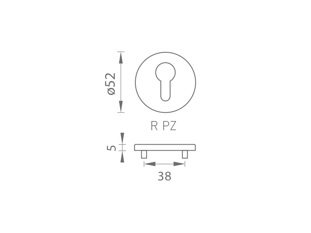 Okrúhla rozeta je vyrobená z materiálov vysokej kvality - mosadz a je povrchovo upravená. Rozeta má priemer 52 mm, hrúbku len 5 mm a oválny otvor pre interiérový kľúč (BB), otvor pre cylindrickú vložku (PZ) alebo WC set s vmontovaným kľúčom. Balenie obsahuje 2 kusy roziet (pár) a rozety WC sú v balení ako set. Rozeta obsahuje patentovanú TUPAI mechaniku s nylonovo-kovovou podložkou s výstupkami - klikmi, ktorá uľahčuje montáž krytky rozety a zabezpečuje stabilné upevnenie bez možnosti samovoľného pohybu krytky.