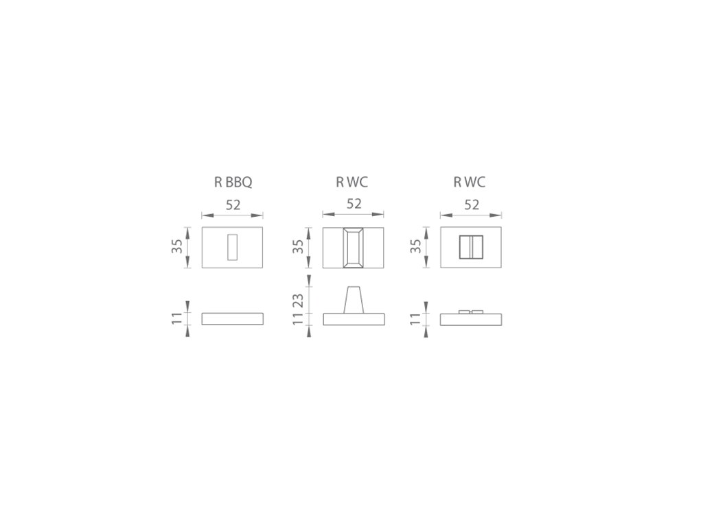 Obdĺžniková rozeta je vyrobená z materiálov vysokej kvality - mosadz/ zamak a je povrchovo upravená. Rozeta má rozmery 52 mm x 35 mm a hranatý otvor pre interiérový kľúč (BBQ) alebo WC set s vmontovaným kľúčom. Balenie obsahuje 2 kusy roziet (pár) a rozety WC sú v balení ako set.Dodatočné parametre