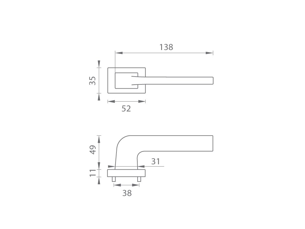 Rozetová kľučka na interiérové dvere s obdĺžnikovou rozetou je vyrobená z materiálov vysokej kvality - zamak a je povrchovo upravená. Rozeta má rozmery 52 mm x 35 mm a štandardnú hrúbku 11 mm.