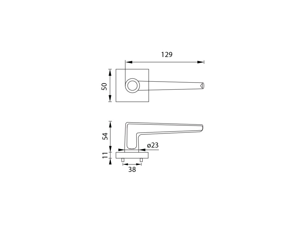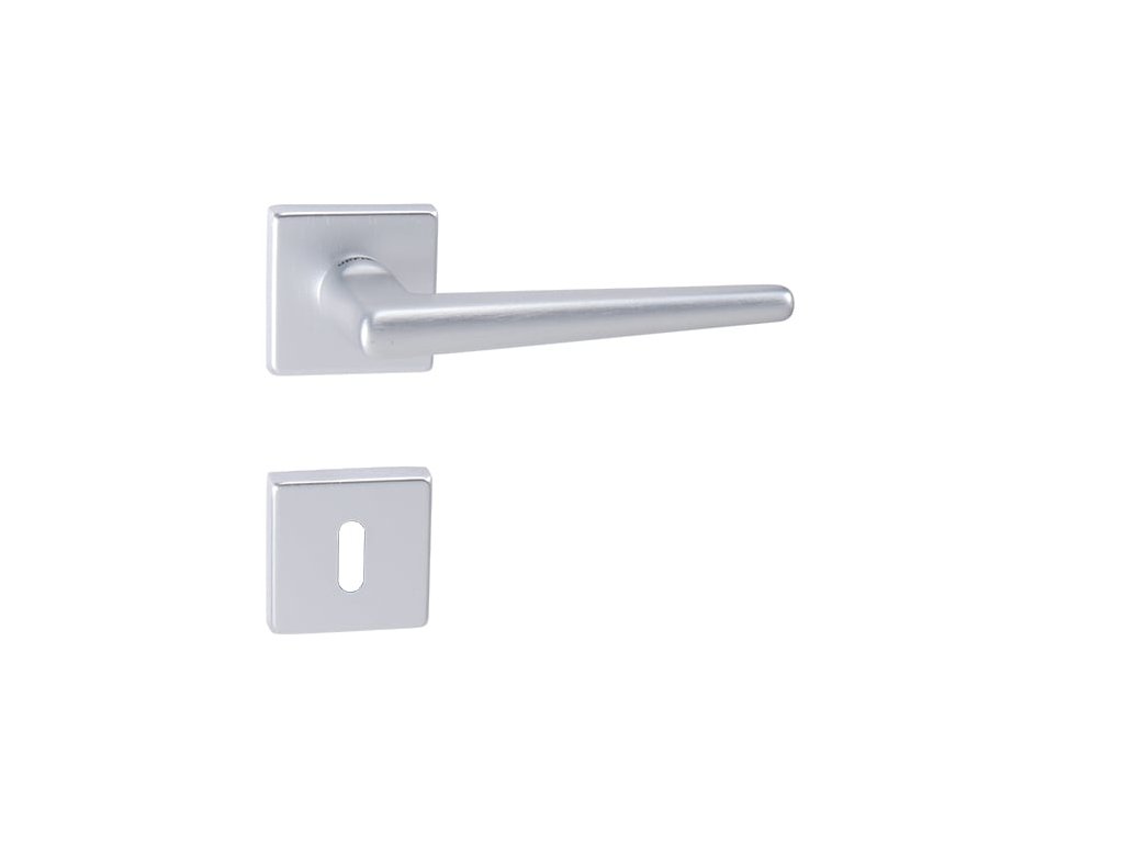 Rozetová kľučka na interiérové dvere s hranatou rozetou je vyrobená z hliníka a je povrchovo upravená. Rozeta má rozmery 50 mm x 50 mm a štandardnú hrúbku 11 mm.