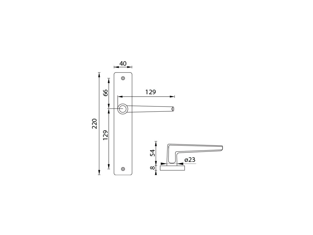 Štítová kľučka na interiérové dvere s dlhým hranatým štítom je vyrobená z hliníka a je povrchovo upravená. Dlhý hranatý štít má rozmery 40 mm x 220 mm a kľučka neobsahuje vratný mechanizmus.