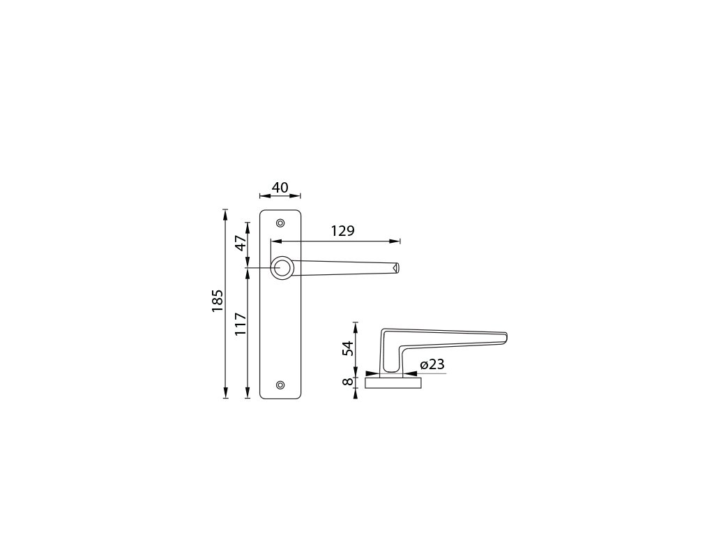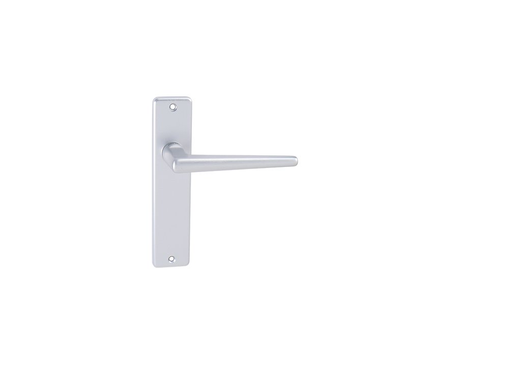 Štítová kľučka na interiérové dvere so skráteným hranatým štítom je vyrobená z hliníka a je povrchovo upravená. Skrátený hranatý štít má rozmery 40 mm x 185 mm a kľučka neobsahuje vratný mechanizmus.