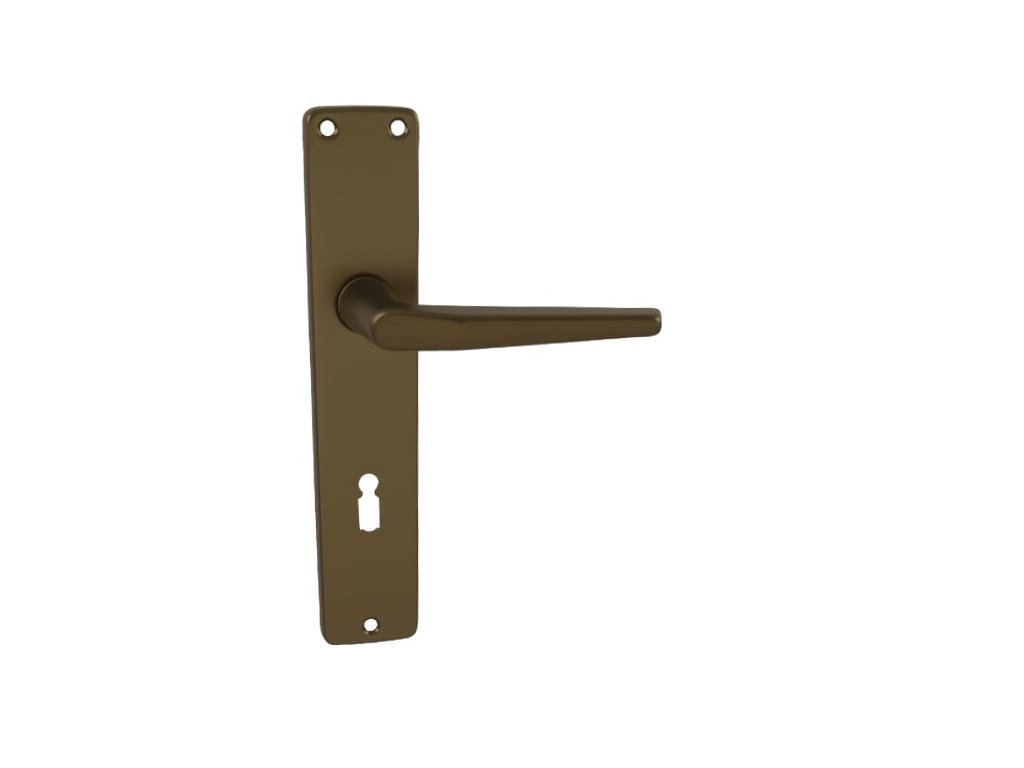 Štítová kľučka na interiérové dvere so štítom je vyrobená z hliníka a je povrchovo upravená. Štít má rozmery: vrchná šírka 44 mm x výška 216 mm x spodná šírka 40 mm. Kľučka neobsahuje vratný mechanizmus.