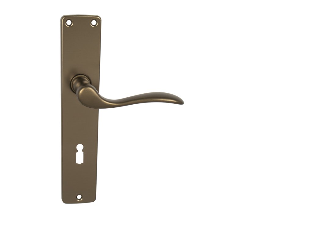 Štítová kľučka na interiérové dvere s hranatým štítom je vyrobená z hliníka a je povrchovo upravená. Kľučka neobsahuje vratný mechanizmus.