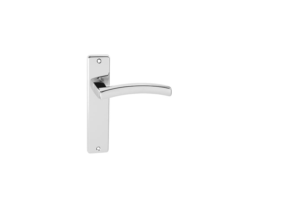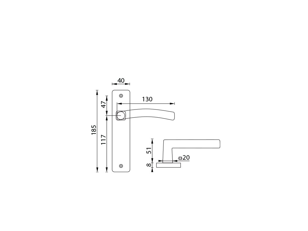 Štítová kľučka na interiérové dvere so skráteným hranatým štítom je vyrobená z hliníka a je povrchovo upravená. Skrátený hranatý štít má rozmery 40 mm x 185 mm a kľučka neobsahuje vratný mechanizmus.