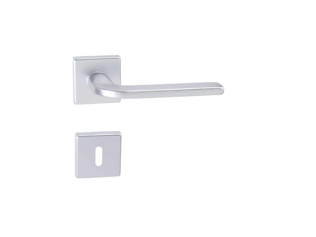 Rozetová kľučka na interiérové dvere s hranatou rozetou je vyrobená z hliníka a je povrchovo upravená. Rozeta má rozmery 50 mm x 50 mm a štandardnú hrúbku 11 mm.