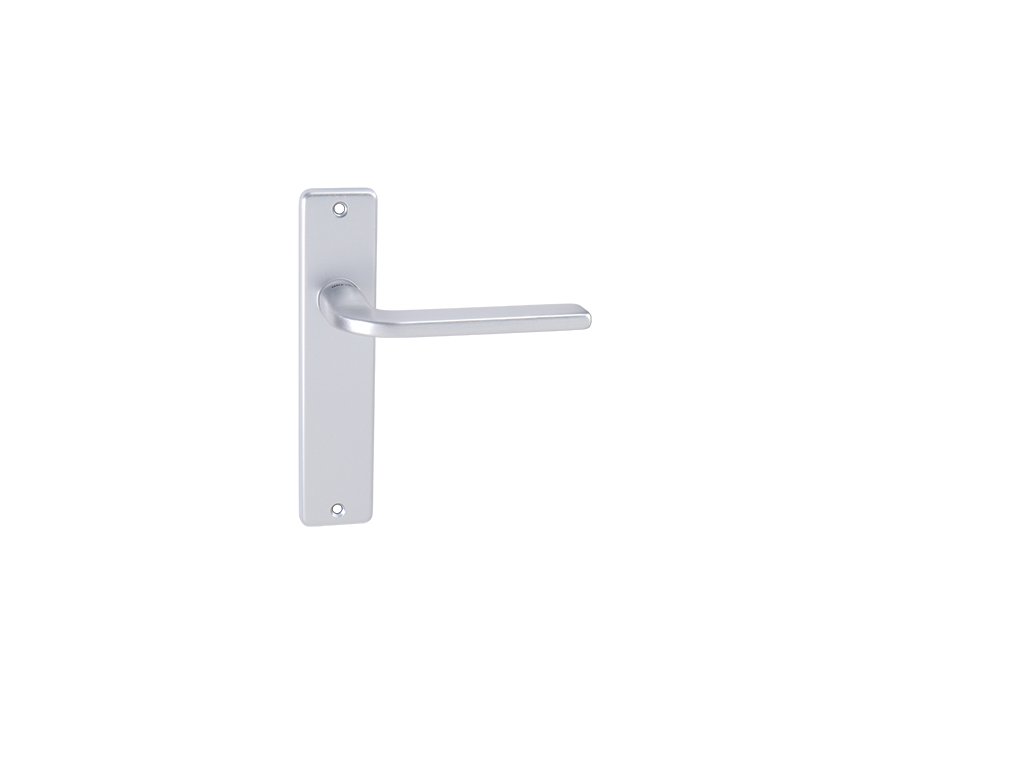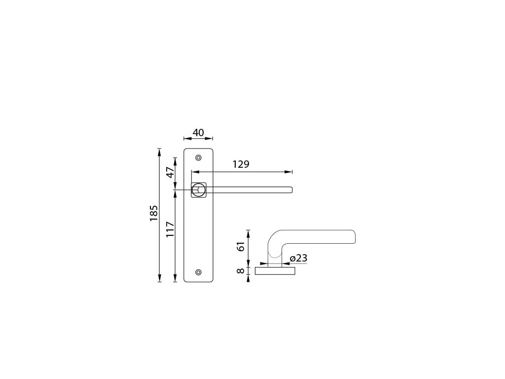 Štítová kľučka na interiérové dvere so skráteným hranatým štítom je vyrobená z hliníka a je povrchovo upravená. Skrátený hranatý štít má rozmery 40 mm x 185 mm a kľučka neobsahuje vratný mechanizmus.