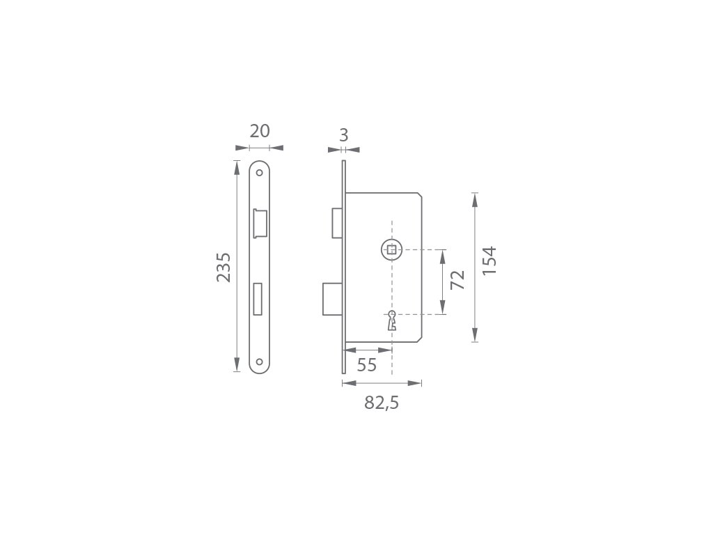 Zadlabávací dvojzápadkový zámok do dverí s otvorom pre interiérový kľúč (BB) s rozmermi čela zámku v dĺžke 235 mm, šírke 20 mm, hrúbke 3 mm. Rozteč (vzdialenosť medzi otvorom na kľučku a vložkou/kľúčom) - 72 mm , zádlab - 82,5 mm a dormas (vzdialenosť osi kľučky od lišty zámku) - 55 mm. Balenie obsahuje zámok a kľúč.