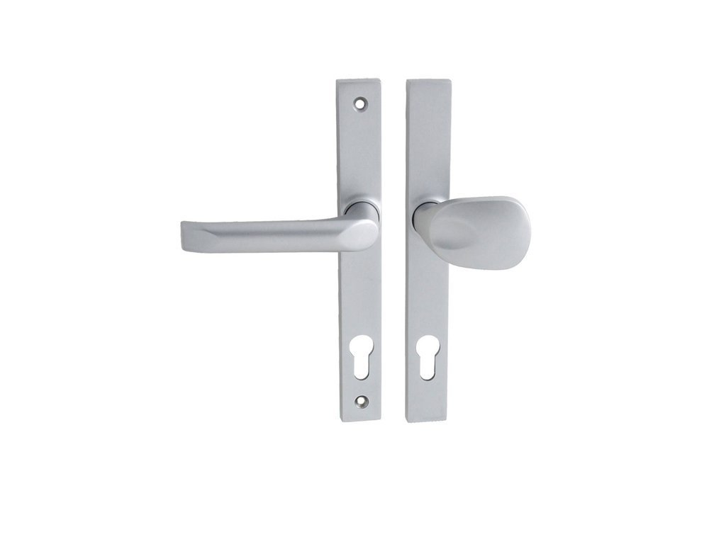 Štítová kľučka na vchodové a bezpečnostné dvere so spevneným hranatým úzkym štítom bez prekrytia cylindrickej vložky je vyrobená z hliníka a je povrchovo upravená. Hranatý úzky štít má rozmery 30 mm x 240 mm a hrúbku 10 mm.