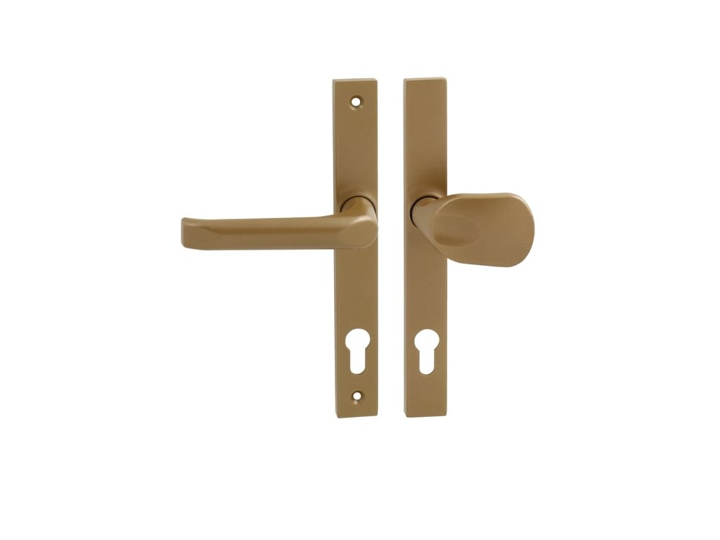 Štítová kľučka na vchodové a bezpečnostné dvere so spevneným hranatým úzkym štítom bez prekrytia cylindrickej vložky je vyrobená z hliníka a je povrchovo upravená. Kľučka je vhodná aj na plastové dvere. Hranatý úzky štít má rozmery 30 mm x 240 mm a hrúbku 10 mm.