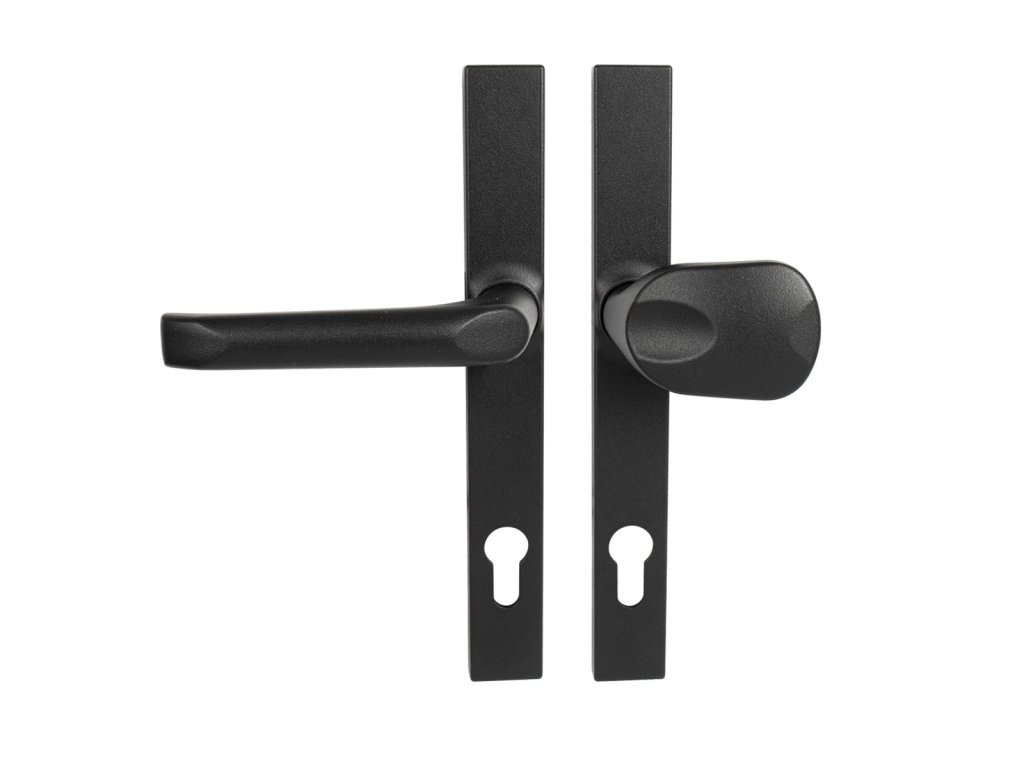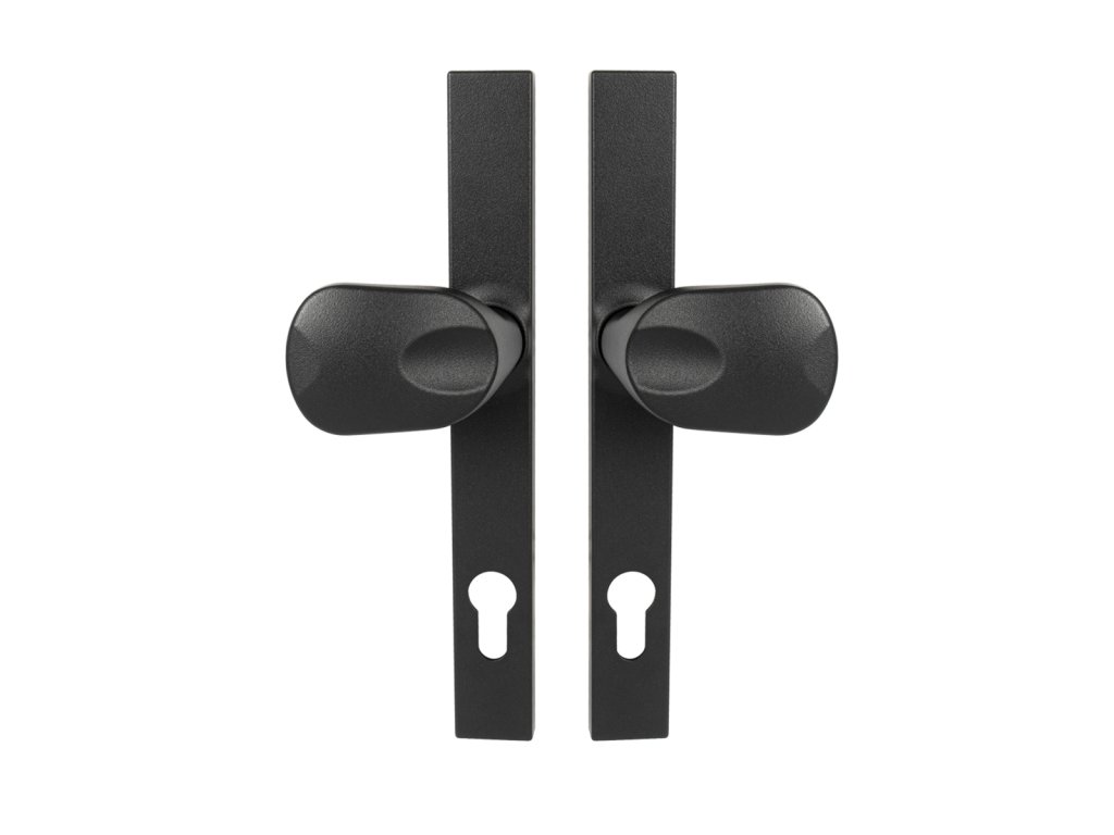 Štítová kľučka na vchodové a bezpečnostné dvere so spevneným hranatým úzkym štítom bez prekrytia cylindrickej vložky je vyrobená z hliníka a je povrchovo upravená. Kľučka je vhodná aj na plastové dvere. Štít sa uchytáva na montážnu podložku pomocou magnetu.