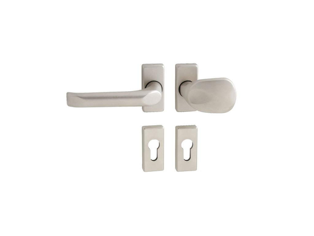Rozetová kľučka na vchodové a bezpečnostné dvere so spevnenou hranatou úzkou rozetou bez prekrytia cylindrickej vložky je vyrobená z hliníka a je povrchovo upravená. Hranatá úzka rozeta má rozmery 31 mm x 68 mm a hrúbku 12 mm.