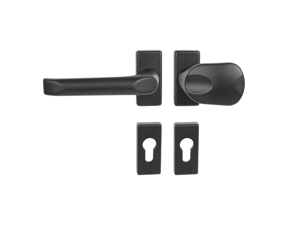 Rozetová kľučka na vchodové a bezpečnostné dvere so spevnenou hranatou úzkou rozetou bez prekrytia cylindrickej vložky je vyrobená z hliníka a je povrchovo upravená.